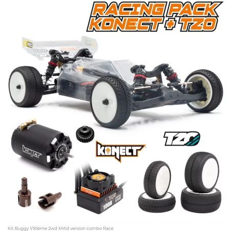 Le X-Mid est désormais disponible en version kit "Combo Race", fourni avec un moteur KONECT ELITE STOCK 13,5T et un ESC KONECT ELITE 100Amp et de noix de cardans renforcées. Un buggy TT 1/10 qui vient compléter notre gamme avec cette version 2 roues motrices.